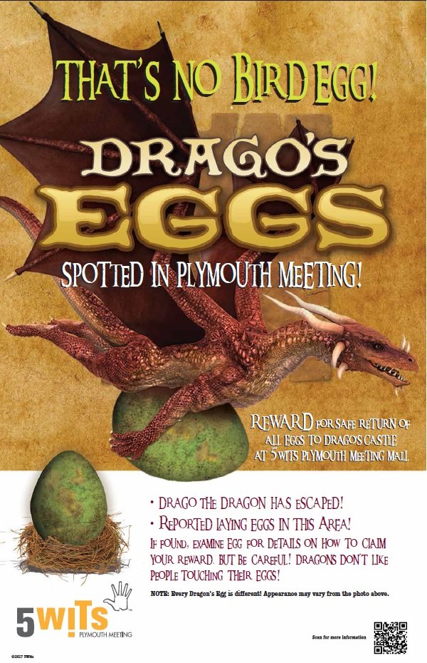 Anyone finding an unusually large egg is urged to upload a photo with the location (selfies are fine) to Facebook, Twitter or Instagram with hashtags #DragonEggs and #5WitsPM before bringing the egg to 5 Wits at Plymouth Meeting Mall on Saturday, November 4. More information is available at http://Bit.ly/DragosEggHunt.
