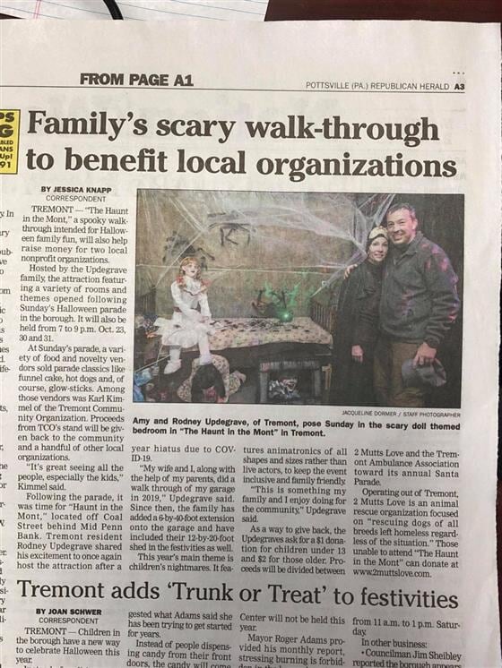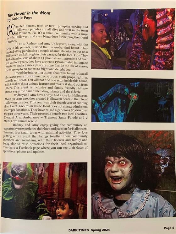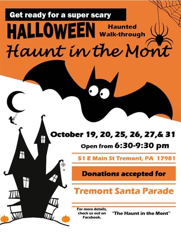 The Haunt in the Mont is a Home Haunt put on by my wife and I . We are located in Tremont PA. We have over 2400 square feet of decorated area to walk through. We do not charge admission by accept donations which are given back to local organizations. We do not have any actors inside, but have over 140 animatronics both electric and some air. We are considered more of an "attraction" than a scary haunt, and we average over 1600 folks through each year. In the last three years we've raised over $6,000 for local organizations in our area. Our haunt is under roof so coming in inclement weather is not an issue. We are open from 6:30-9:30 on the nights listed. Every year we get folks coming from further and further away to check out what we do. Please come check it out.